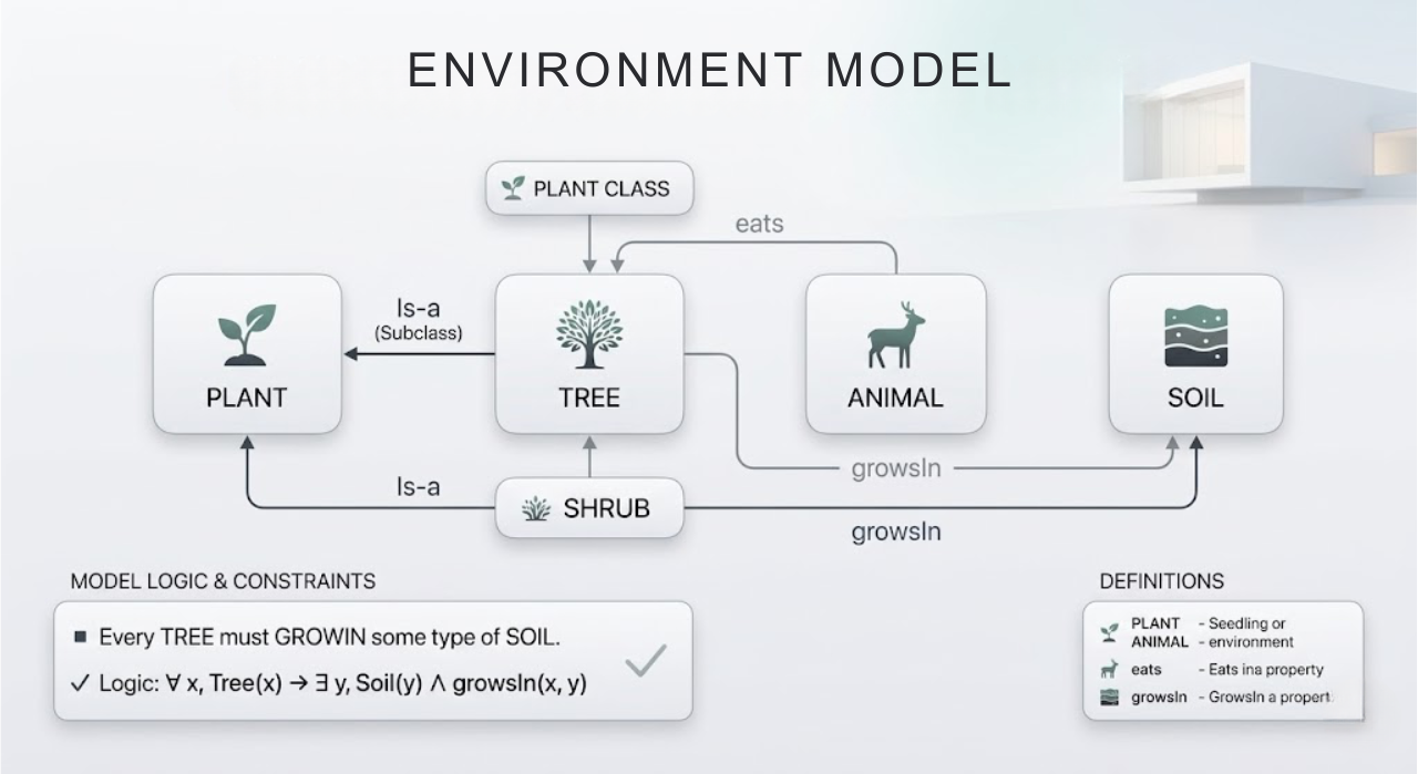 Plant,Tree,Shrub,Animal, andSoil. TreeandShrubare types ofPlant.- Animals can have a relation like